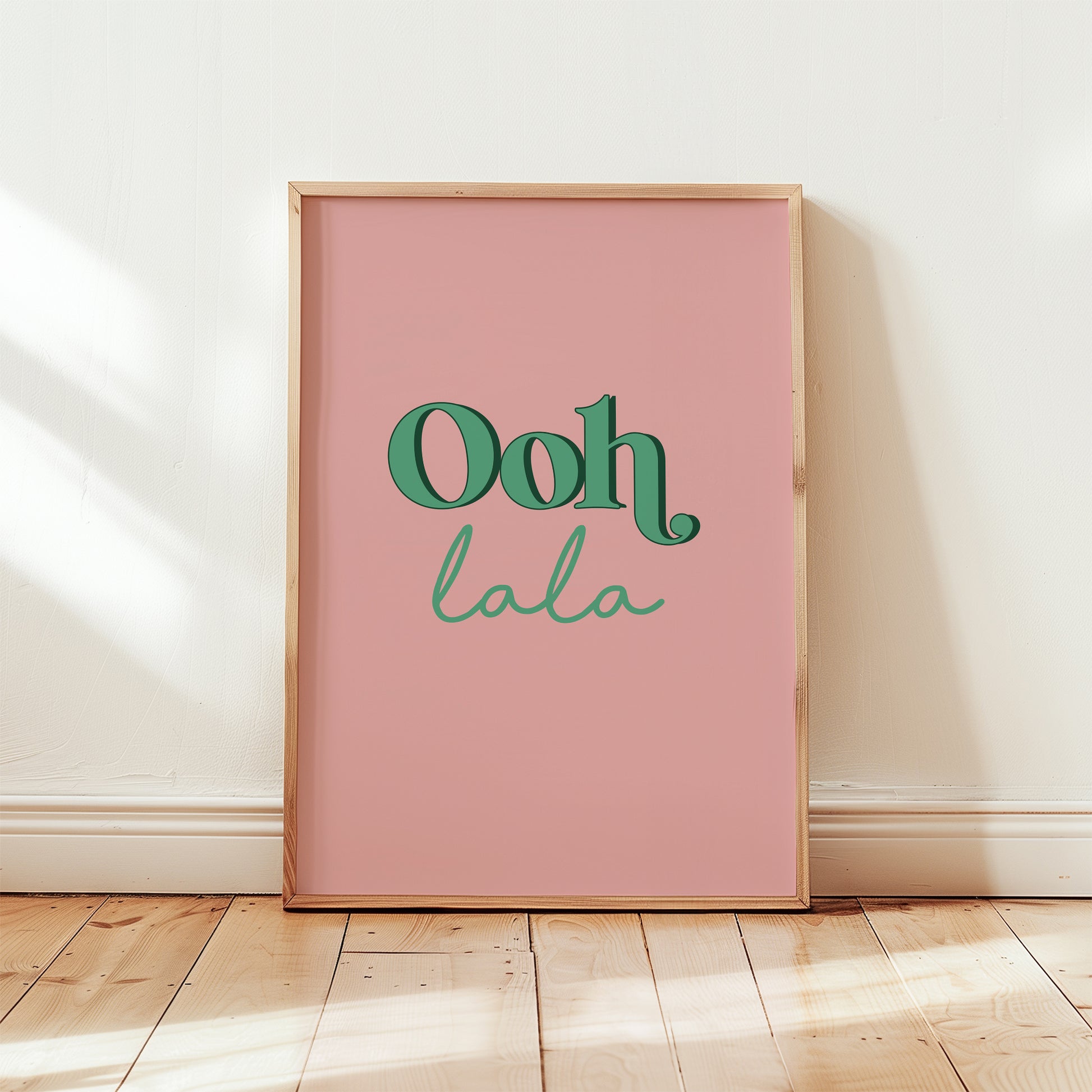 Ooh lala Print. Original typographic in bright contrasting Pink against a Teal background.